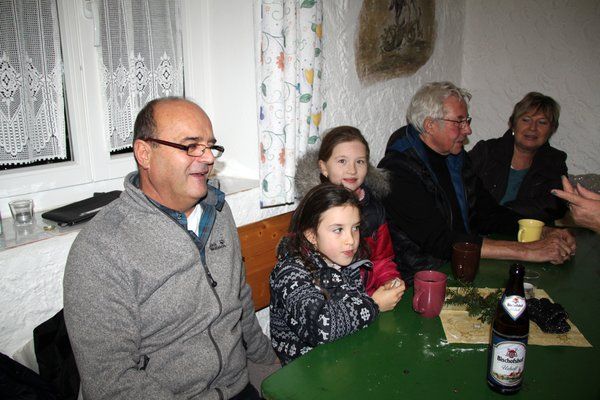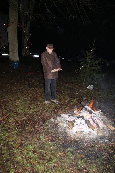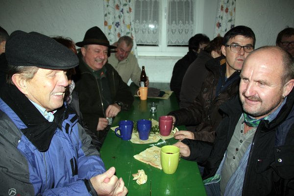 Derweil hatten draußen fleißige Mitarbeiter des Schnupfer-Clubs vor dem Eggenberghaus ein wärmendes Feuer angezündet, an denen sich die Gottesdienstbesucher äußerlich wärmen konnten. Zum „inneren Aufwärmen“ gab es heißen Glühwein und Stollen zur Stärkung, die auch im wohlig warm geheizten Eggenberghaus schmeckten, für den Abstieg aus den Höhen des Hirschwaldes. Anschließend begingen die Mitglieder des Schnupfer-Clubs im Gasthaus Dietz bei saueren Bratwürstln und Zithermusik den weltlichen Teil ihrer Weihnachtsfeier.