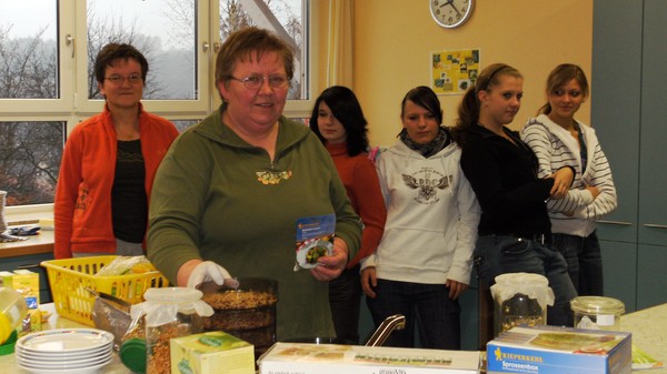Die Hauswirtschaftsgruppen der Klassen 7 und 8 beschäftigten sich auch praktisch mit gesundem Brotbelag – selbstgezogene Sprossen auf frischem Bauernbrot mit Butter: ein selten zuvor gemachtes Geschmackserlebnis, das unter Anleitung von Maria Mayer aus Rieden viel Anklang bei den SchülerInnen fand. Diese Gruppe hatte unter Anleitung von Fachlehrerin Agnes Kramer auch schon eine Saftpress- Aktion im Kloster Ensdorf gestartet und konnte am Gesundheitstag bei den Wanderfreunden selbst gepressten Quittensaft und Quittenmarmelade aus eigener Produktion an den Mann bzw. die Frau bringen.