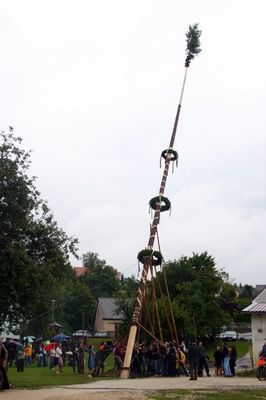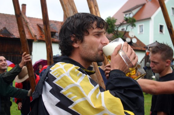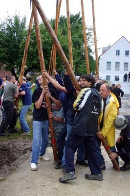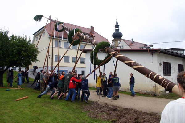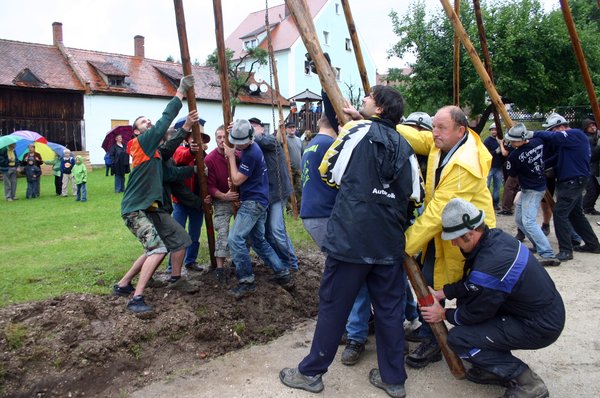 Traditionell wurde dann der Baum von heuer 44 starken Burschen und Männern an fünf „Goaßn“ und viel „Armschmalz“ in die Senkrechte gebracht. Normalerweise eine schweißtreibende Arbeit. Heuer kam ob der kühlen Temperaturen kaum einer ins Schwitzen. Dennoch mussten sich die Kirwaburschen und ihre Helfer, darunter auch die beiden Feuerwehrkommandanten Hans Singer und Hubert Haller sowie Feuerwehrvereinsvorstand Richard Reiser, mächtig ins Zeug legen. „Mai ham mir an Durscht!“ brauchten sie heuer gar nicht erst zu rufen. Die Kirwamoidln eilten auch so gleich herbei, um mit Gerstensaft dafür zu sorgen, dass das „Schmalz“ nicht ausging. „Auf mein Kommando! Alle Manna an die Goaßn! Hau-Ruck! Nu an Schub!“ forderte unerbittlich „Baummeister“ Karl Schmid. Hoch aufgerichtet ragt der Ensdorfer Kirwabaam nun nach getaner Arbeit über das Dorf, das sich zu Recht „Perle des Vilstales“ nennt, wehen die weißblauen Bänder von den drei grünen Kränzen.