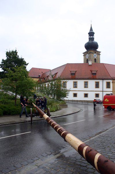 Nach Gewitter, Sturm und Starkregen in der Nacht ließ der Regen zunächst nach als am Vormittag des Samstags die strammen Kirwaburschen den kerzengerade gewachsene 31 Meter langen Kirwabaam aus dem Wald holten, teils geschälten und „ringelten“. „Schnitzer“ Manuel Wondrak und seine Helfer verewigten in der Rinde „25 Jahre Kirwapaare Ensdorf – 1984 – 2009“, dazu zwei Herzchen. Die feschen Kirwamoidln hatten Abende zuvor schon drei riesige Kränze gebunden und versahen sie nun mit weißblauen Bändern.