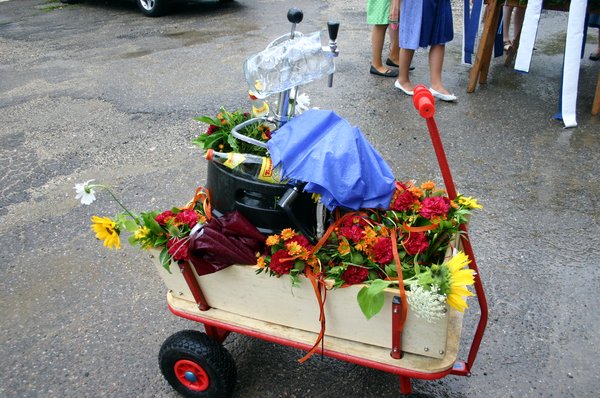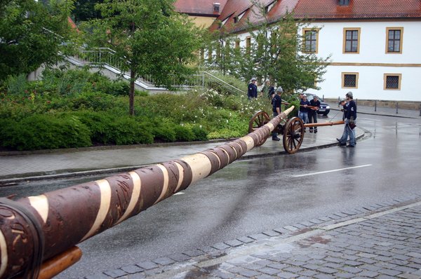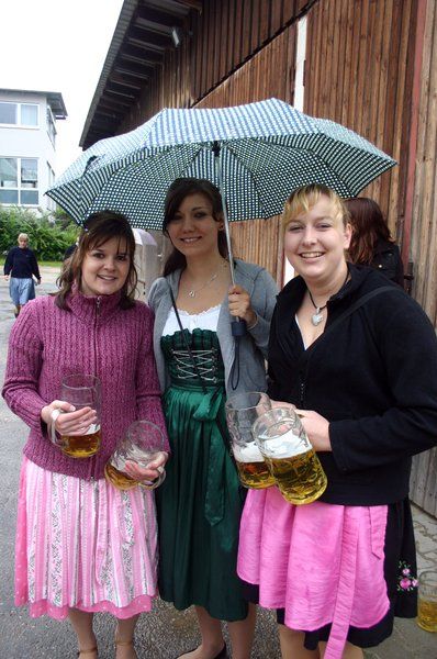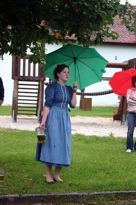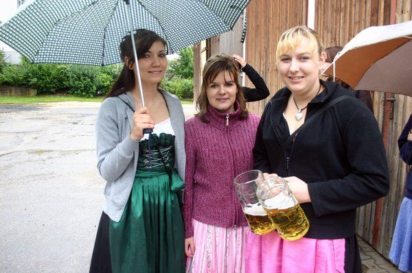 Allerdings „pünktlich zum Einholen des Kirwabaums um 14 Uhr öffnete Petrus wieder die Schleusen und es schüttete wie aus Eimern. So hörte man auch nur wenige Juchzer der strammen Kirwaburschen durch den Ort hallen – allerdings das kräftige „tuck-tuck“ des 25 PS starken Fendt „Dieselross“ des „Beckn-Girgl“. Mit einem Doppelläufer zog Kellner Junior mit dem Oldtimer Baujahr 1967 die stattliche 31 Meter lange Fichte – heuer witterungsbedingt ohne Quetschn-Musik - durch den Ort. Begleitet wurde der Zug natürlich von den hübschen Kirwamoidln unter Regenschirmen und unter Regenjacken versteckten feschen Dirndln mit dem Kirwakrug und dem obligatorischen Fassl Bier auf dem Leiterwagerl. „Wer hot Kirwa?“ wurde gerufen. „Mir hom Kirwa! Wer hot die schöinsten Kirwamoidln? Mir homs! Wer hot die stärksten Kirwaburschen? Mir homs! Wer hot den längsten und schönsten Kirwabaam? Mir hom an! „Wia san ma? Guat san ma! Mai, san mia guat!” “Mai liaber, in Ensdorf dou is Kirwa” wurde gesungen und “Drei Dog, drei Dog gehn ma nimmer ham!” Eng und knapp wie jedes Jahr wurde es bei der Einbiegung zum Festplatz beim Rathaus. Nur mit Müh’ und Not schafften die Kirwaburschen die Kurve.