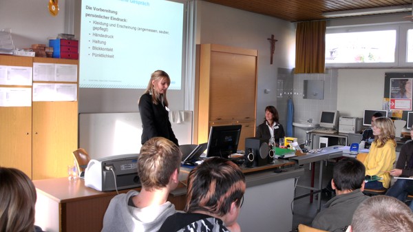 Für beide Klassen gemeinsam referierten Frau Kerstin Hüther, Personalmanagerin bei Conrad Electronic Hirschau, sowie deren Auszubildende Sabine Zeitler, über die Einstellungs- und Aufstiegschancen bei einem Großkonzern. Die Botschaft „für den ersten Eindruck gibt es keine zweite Chance“ (bei der persönlichen Vorstellung), ließ manche Zuhörer aufhorchen und erkennen, dass es allmählich „um die Wurst“ geht, sprich den passenden Ausbildungsplatz geht und die die geeignete entsprechende Vorstellung.
