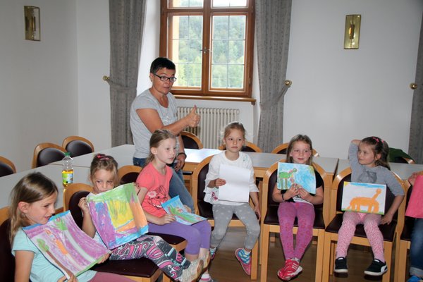 Ganz fasziniert lauschten die elf Mädchen und zwei Buben der Geschichte, hingen ihr quasi an den Lippen, denn spannend war die Geschichte von dem kleinen Bronto, der in den großen Wäldern eines von vielen Dinosaurierkindern war. Er hatte zwar viele kleine Freunde, aber auch einen Feind: Rex, den Schrecklichen! Doch kleine Dinosaurier haben manchmal mehr im Kopf als Große, stellte sich heraus. Mit einem Butterbrot trickste der kleine Bronto den großen Rex aus. „Quatsch!“ sagte nämlich der Bronto zu Rex und lachte: „Bist du empfindlich? Das ist doch bloß ein Butterbrot. Ich esse mein Butterbrot immer mit einer doppelten Portion Pfeffer, einem Haufen Zwiebeln, Senf und extra scharfen Peperoni.“ Da spie der große Rex Feuer und verkroch sich heulend.
