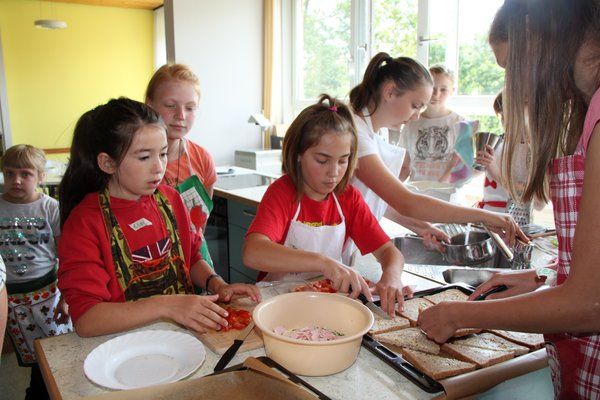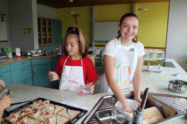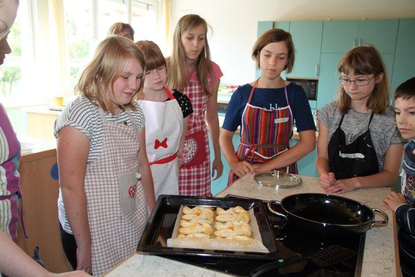 13 Mädchen, darunter auch ein Bub schnippelten, buken und kochten unter Leitung von Martha Wein und Gisela Bösl, arbeiteten mit Handrührgerät, auch mit den Händen dickflüssige Teige an, erhitzte Butter, schlugen Eier in die Pfanne, rührten Milch und Pudding. Dann schoben sie die ihre Sachen in die Röhre.
