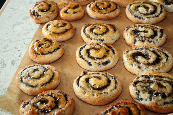 Die Mohnfüllung gleichmäßig auf dem Teig verstreichen. Dabei etwa 1 Zentimeter an den Rändern freilassen. Den Teig von der langen Seite aufrollen und mit einem Messer in etwa 3 Zentimeter breite Scheiben schneiden. Diese auf das Backblech legen und bei Einschub Mitte etwa 20 Minuten backen. Aprikosenaufstrich mit Wasser aufkochen, mit dem Pinsel auf den noch warmen Schnecken verstreichen und erkalten lassen.