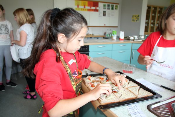 Ein volles Programm also, das nur nach genauer Anweisung und in Teamarbeit zu bewältigen war. In Gruppen waren die Mädchen und der Bub für die Herstellung von Pizza mit Quark-Ölteig, bunten Kochquark, Pizette, Käse-Schinkenhörnchen, Hotdog-Spießchen, kleinen Mohnschnecken, Blätterteigwindrädern mit Quarkfülle sowie Gierschlimonade zwei Stunden beschäftigt. Dan war die Arbeit geschafft und nach dem Abspülen und Aufräumen schmeckten allen ihre Party-Schlemmereien prächtig. Die Reste wurden verpackt und mit nach Hause genommen für Mama und Papa.