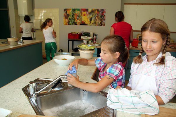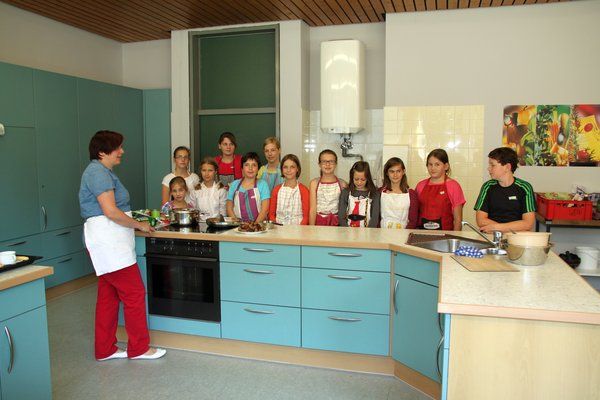 Zwölf Kinder im Alter von acht bis zwölf Jahren – elf Mädchen und ein Bub – bereiteten unter Anleitung von Karin Scharl und Martha Wein selbst ein leckeres Menü zu – bestehend aus Zucchinisuppe, Nudeln mit Hackfleischbällchen, Mini Hot Dogs, süße Quarkspeise mit Früchten, knackig frischen gemischten Salat und als Nachspeise Eistüten zu. Auch die selbst hergestellt Zitronenlimonade schmeckte den Kindern hervorragend