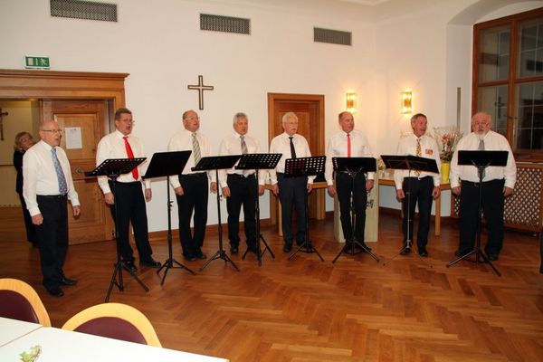 Das Lied „Männer mag man eben …“ leitete über zum Grußwort des Herbert Kick, Ehrenvorsitzender des Sängerkreises Nordoberpfalz. „Bei der Sängergruppe Amberg ist es inzwischen eine schöne Tradition geworden, dass Ehrungen verdienter Sängerinnen und Sänger in einem eigens anberaumten Ehrenabend durchgeführt werden, zu dem alle Mitglieder mit ihren Angehörigen eingeladen werden“, lobte er. „Er dient aber auch dazu, um Danke zu sagen für die vielen Mühen im laufenden Jahr und den vergangenen.“ Kick überbrachte auch die Glückwünsche des Fränkischen Sängerbund und des Deutschen Chorverbandes für die er Urkunden und Ehrennadeln überreichte. Er dankte allen Mitgliedern und deren Angehörigen für all das, was sie in vielen Jahren für Verein bzw. Chor getan haben und damit zum Gelingen eines funktionierenden Vereinlebens beigetragen haben. „Wer aktiv ist und sich oft in der Öffentlichkeit zeigt und auftritt, hat auch sehr viel Vorbereitung und Proben hinter sich“, hob er hervor und dankte dafür besonders. Kick berichtete, dass es derzeit in der Bundesrepublik nahezu drei Millionen Sängerinnen und Sänger mit Musik und Chorgesang befassen und auch aktiv betreiben. „Sie alle leisten dadurch schon mehr als jeder normale Staatsbürger. Sie investieren freiwillig und ehrenamtlich sehr viel Zeit, Geld und Energie und fragen nicht: Was bringt es mir? Außerdem sorgen sie dafür mit den Liedern vielen Mitmenschen eine Freude und Abwechslung geschenkt wird“, betonte er. Leider werde dieser Einsatz nur von wenigen anerkannt. Vielmehr müsste man sich fragen, Was wäre los, wenn es keine Vereine und ehrenamtliche Mitarbeiter gäbe? Wer würde das kulturelle, musikalische und gesellschaftliche Leben gestalten? Schließlich zitierte der Ehrenvorsitzende den Hl. Augustinus, der gesagt hat „Wer singt – betet doppelt!“ So sei er überzeugt, dass Sänger irgendwann auch im Himmel belohnt würden. Er schloss mit den Worten des indischen Dichters und Philosophen Rabindranath Tagore: „Gott achtet mich, wenn ich arbeite, aber er liebt mich, wenn ich singe.“ „Veni, vidi, vici wunderbar …“ sang das Vokalensemble vor der Pause mit Büfett und bekam viel Applaus. Und danach als homage: „Frauen sind anders …“