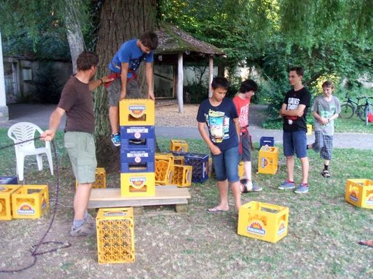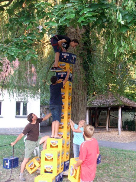 Zwölf Jungs nahmen die Herausforderung von Mitbruder Robert Reiner an, sich am freiwilligen Programm zu beteiligen und Bierkisten zu stapeln. Gesichert in Klettergurten und Seilen, an einer Weide, versuchte sich ein jeder daran, aus eigener Kraft Bierkisten aufeinander zu stapeln und diese dabei gleichzeitig zu erklimmen. Teamwork war gefragt. Je höher der Turm wurde um so mehr Einsatz mussten die Mitstreiter zeigen, dem Erklimmenden Kisten in die Höhe reichen und Mut zu sprechen, damit es dieser noch weiter schaffen würde. Mit viel Ruhe, Geschick und Ausdauer entstanden riesige Türme und es wurde sogar unter Höchstleistung einer mit 18 Kisten gestapelt. Alle waren mit Freude und Feuereifer dabei.